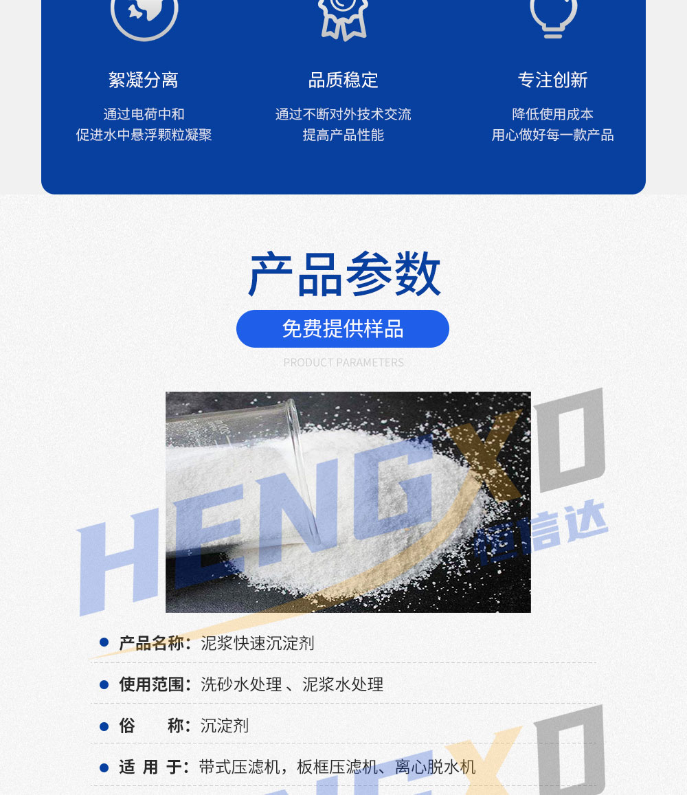沉淀劑,使用范圍:洗砂水處理、泥漿水處理,具體使用:絮凝沉淀、泥水分離,結(jié)合洗砂泥漿水質(zhì)、處理工藝、脫水設(shè)備等情況選擇合適的產(chǎn)品及使用方案,具體請聯(lián)系我們。性能特點:1、可低濃度溶解使用。2、用量少、沉淀快、絮團(tuán)緊密、水體清澈等。3、提高脫水效率和泥餅干度。4、適用于帶式壓濾機(jī),板框壓濾機(jī)、離心脫水機(jī)等。